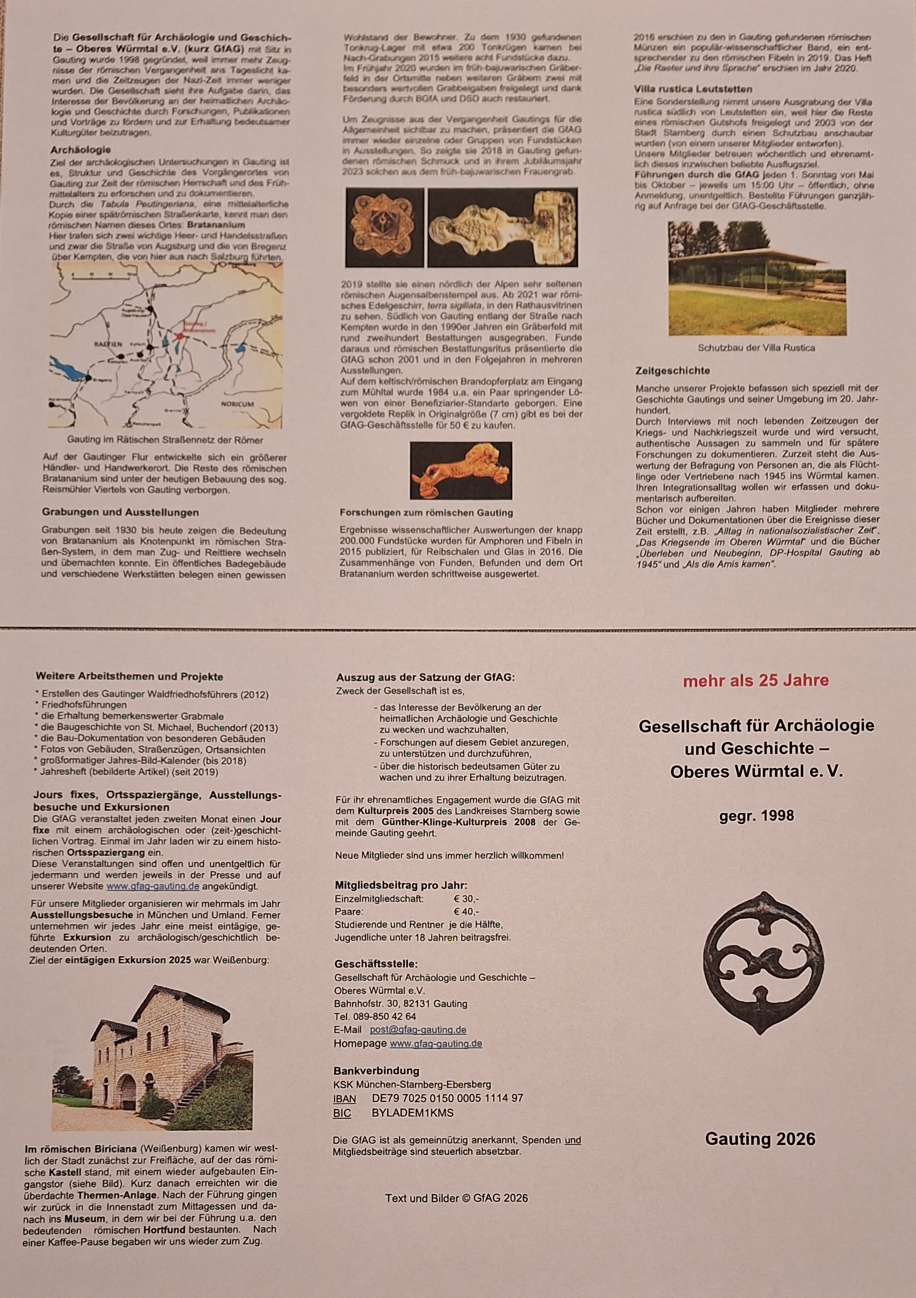 Der nachstehende Flyer gibt einen gerafften Überblick über unsere Gesellschaft. Er ist in unserer Geschäftsstelle, beim jeweiligen Jour fixe, im Gautinger Rathaus (Schriftenstand) und während der Führungen an der Villa rustica bei Leutstetten erhältlich. Er wird jährlich einmal aktualisiert.